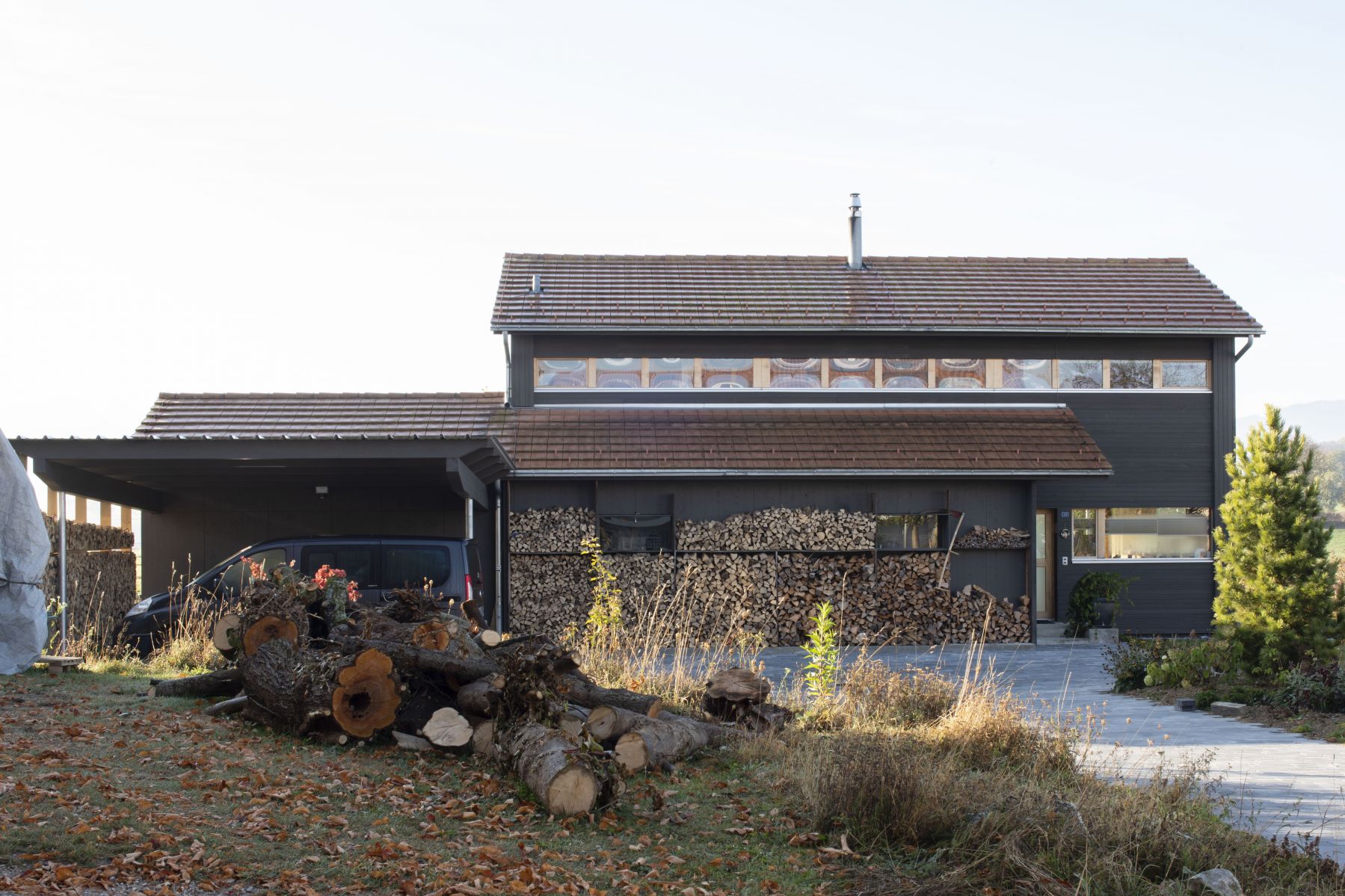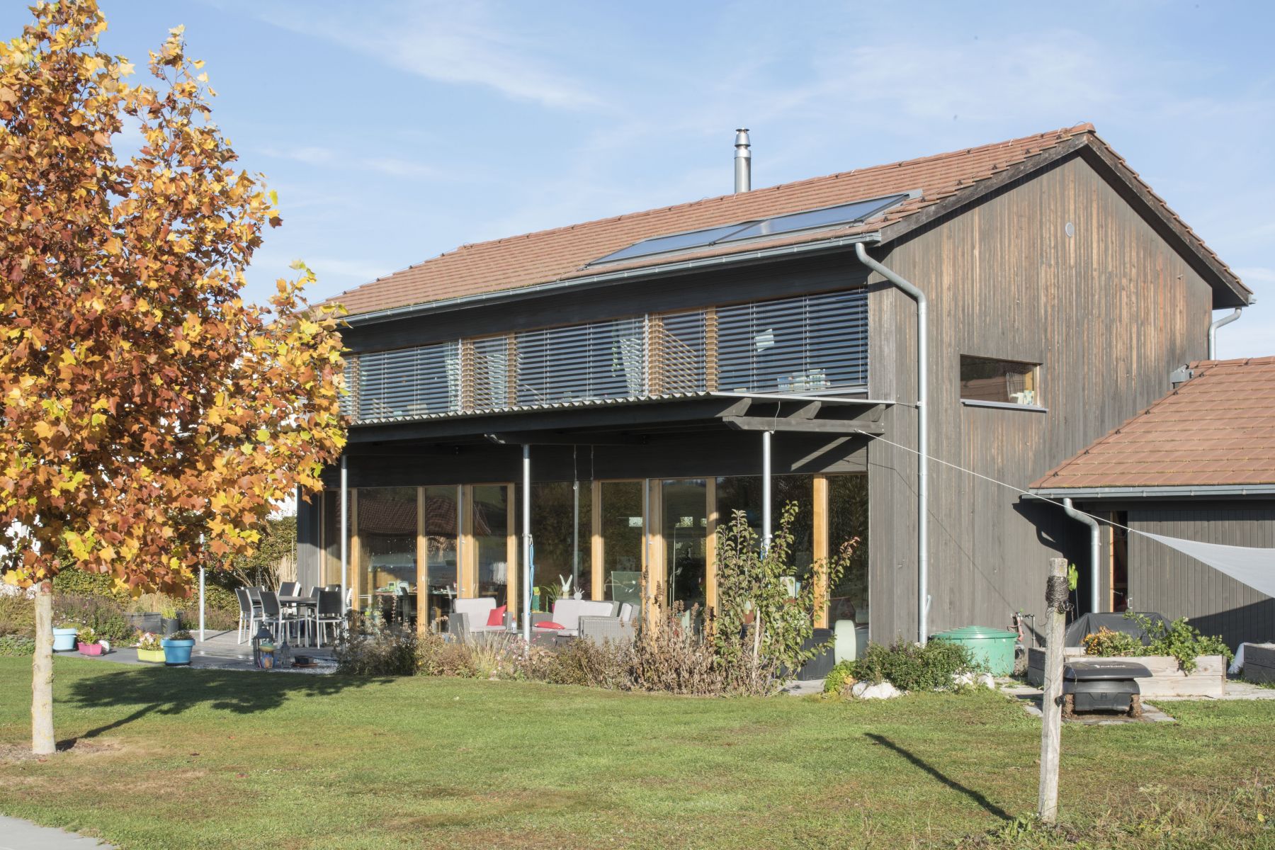 Certificat Minergie FR-360; chauffage avec fourneau en pierre ollaire, capteurs solaires.