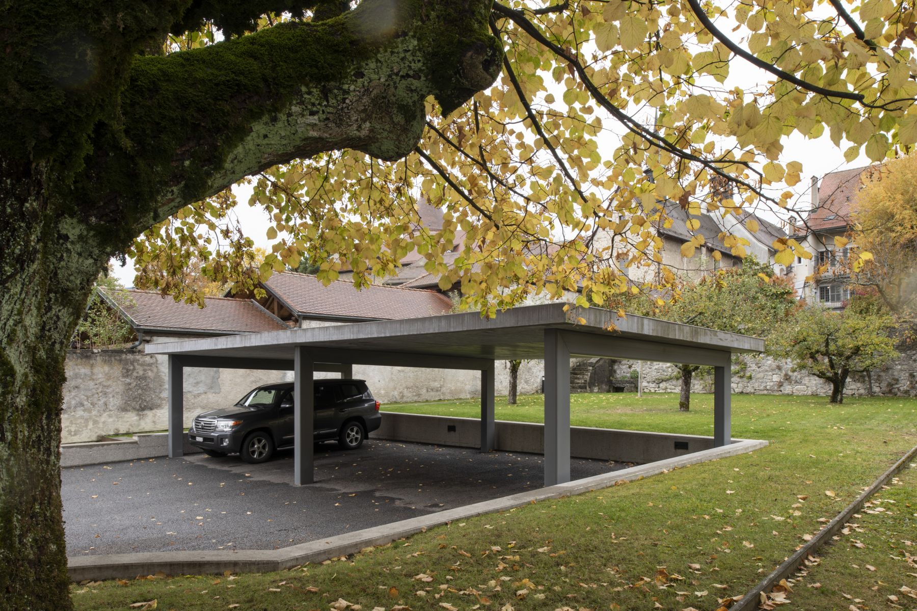 Construction d'un couvert à voitures et aménagement du jardin.